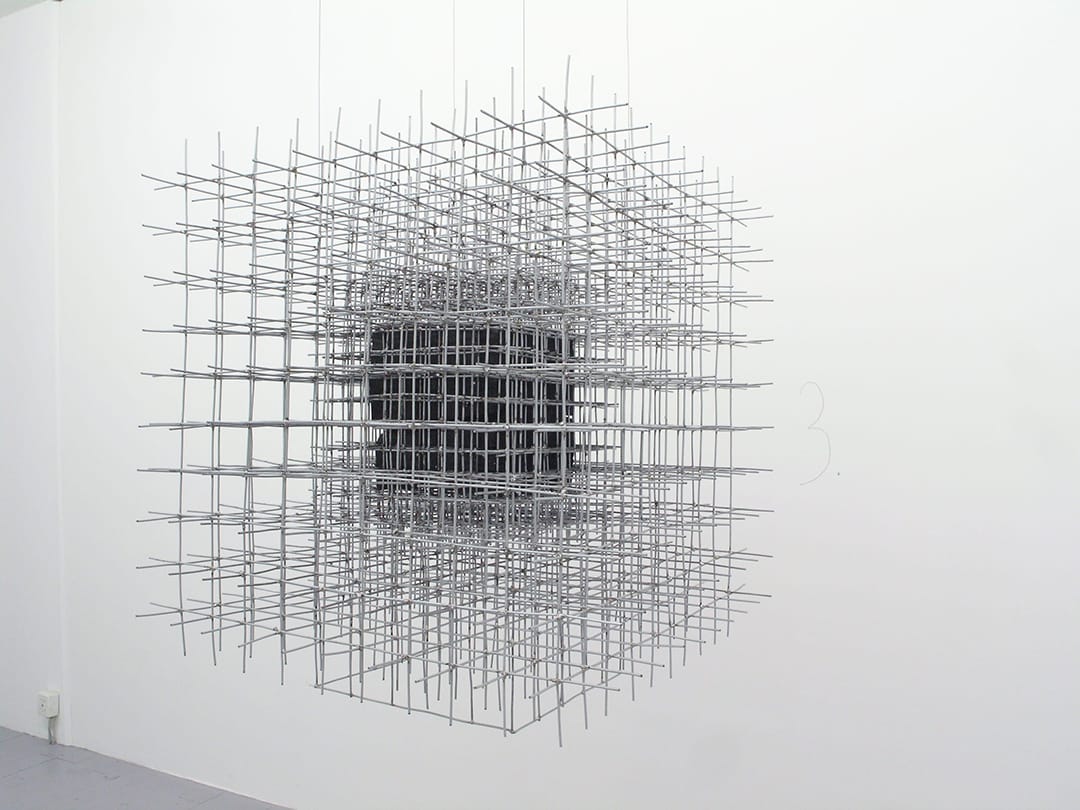 Comme nous venons de le préciser, la rencontre entre plusieurs tiges va causer l’apparition d’un cube, uniquement visible par ses arètes. Il peut se voir comme une particule individuelle solidifiée, à considérer qu’on lui prête une existence propre. Aussi il importe de bien mentionner que ses faces et son contenu sont invisibles, produit par l’essence même du vide. Les arètes sont les lignes qui extraient d’une totalité une entité, et qui la dissocient du reste de l’espace. Ainsi, si nous juxtaposons un cube à un autre, nous arrivons à la formation de plusieurs éléments : Un cube ajouté à un autre permet de créer une ligne de cubes, et cette même ligne, juxtaposée, introduit le plan. Chaque plan étant lui-même accumulé en couches, nous voyons se former une structure globale, non moins différente de l’élément individuel que sera le cube initial. (Point-ligne-plan-volume) Nous parvenons donc à démultiplier de façon tant verticale qu’horizontale (stratifiée ou linéaire) une structure complexe en ne faisant usage que d’un seul petit individu, le cube. Il est l’unité de mesure, l’espace délimité. La cellule. C’est dans ce sens que nos pièces, dont la composante se définit comme un ensemble de cubes, permettent, lorsque placées dans un endroit quelconque, de mesurer, de délimiter une parcelle d’espace réel.