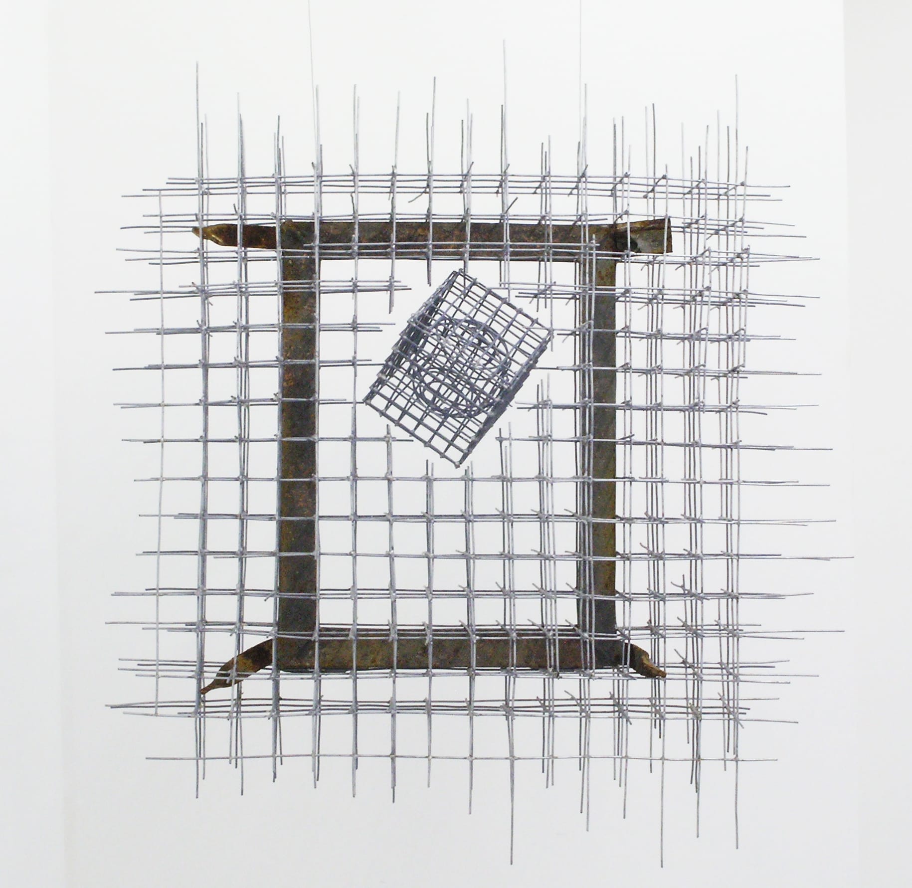 Caractéristiques : Cadre rectangulaire rouillé, inter-pénétré de tiges de métal gris (lesquelles forment plusieurs couches de grille superposées). A l’intérieur du cadre, positionné sur le haut, se trouve un cube grillagé contenant en lui-même une sphère (elle-même composée de petites sphères). Le cube est placé de façon instable et semble flotter, sans reliance.