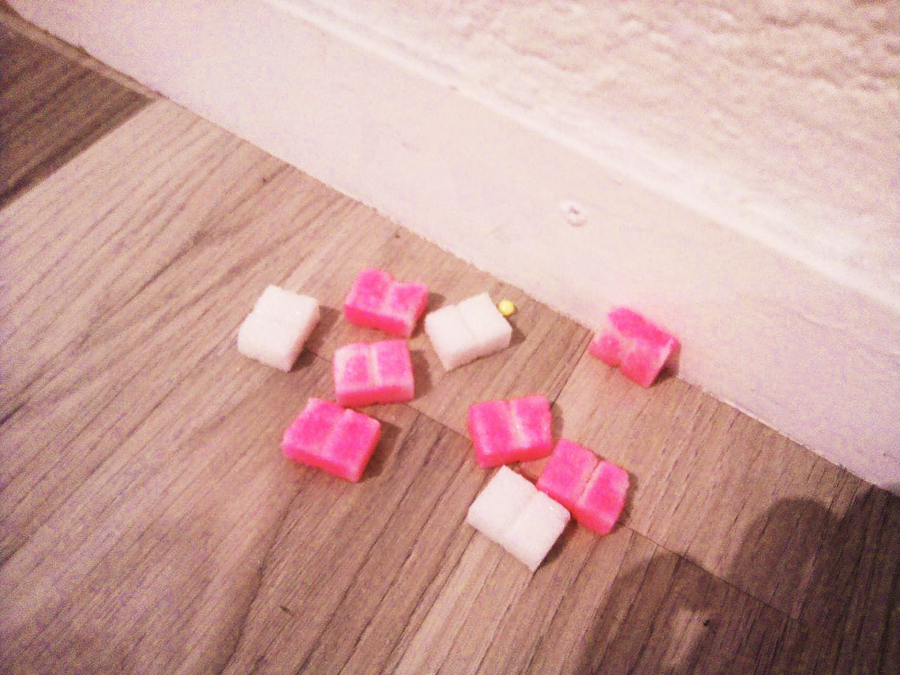 18 séries de bonbons au nombre de 8 étaient placées dans deux plats roses, à la disposition des visiteurs.