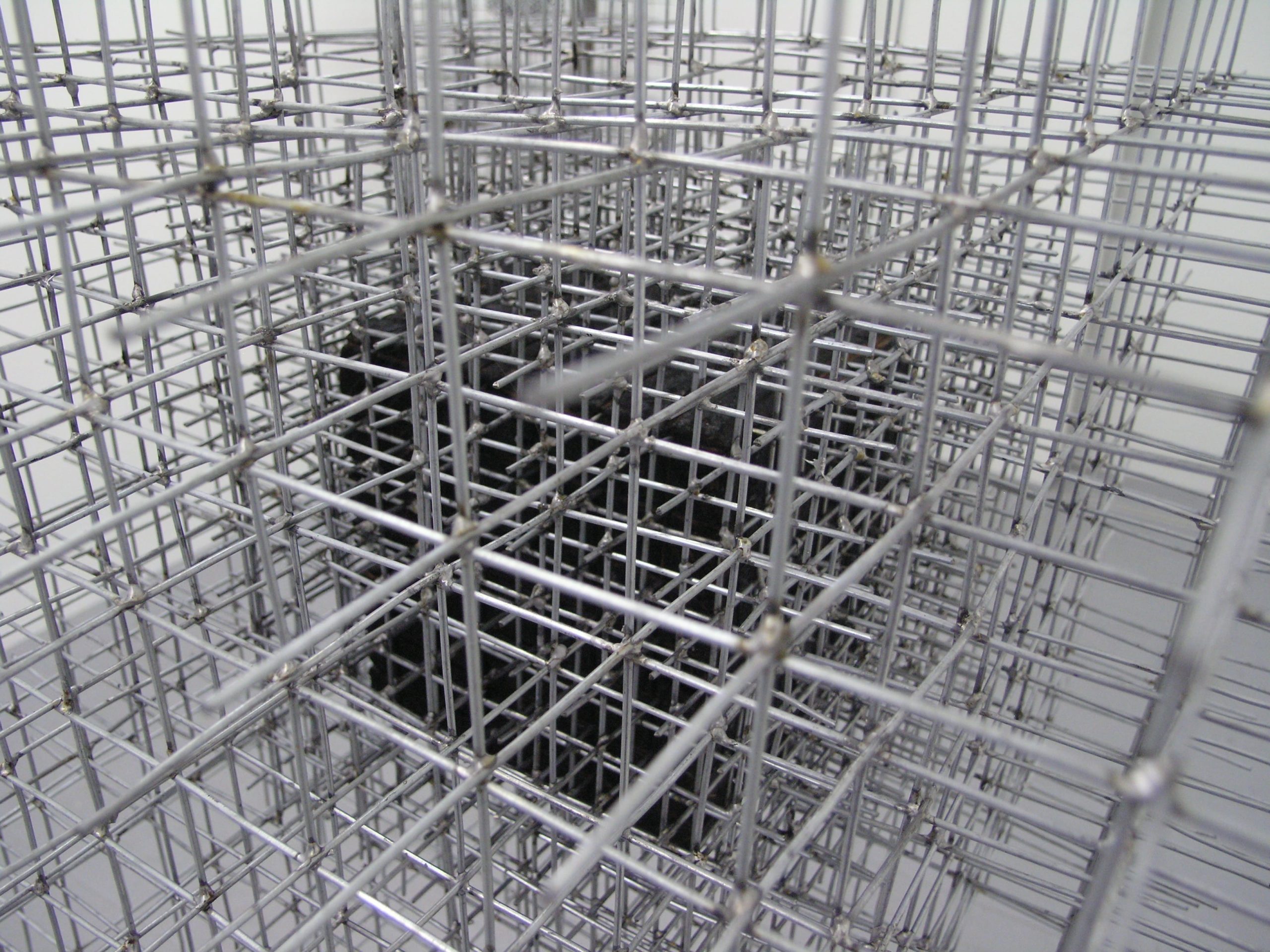 Comme nous venons de le préciser, la rencontre entre plusieurs tiges va causer l’apparition d’un cube, uniquement visible par ses arètes. Il peut se voir comme une particule individuelle solidifiée, à considérer qu’on lui prête une existence propre. Aussi il importe de bien mentionner que ses faces et son contenu sont invisibles, produit par l’essence même du vide. Les arètes sont les lignes qui extraient d’une totalité une entité, et qui la dissocient du reste de l’espace. Ainsi, si nous juxtaposons un cube à un autre, nous arrivons à la formation de plusieurs éléments : Un cube ajouté à un autre permet de créer une ligne de cubes, et cette même ligne, juxtaposée, introduit le plan. Chaque plan étant lui-même accumulé en couches, nous voyons se former une structure globale, non moins différente de l’élément individuel que sera le cube initial. (Point-ligne-plan-volume) Nous parvenons donc à démultiplier de façon tant verticale qu’horizontale (stratifiée ou linéaire) une structure complexe en ne faisant usage que d’un seul petit individu, le cube. Il est l’unité de mesure, l’espace délimité. La cellule. C’est dans ce sens que nos pièces, dont la composante se définit comme un ensemble de cubes, permettent, lorsque placées dans un endroit quelconque, de mesurer, de délimiter une parcelle d’espace réel.