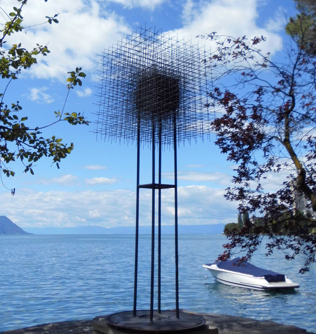 Caractéristiques : Cadre rectangulaire rouillé, inter-pénétré de tiges de métal gris (lesquelles forment plusieurs couches de grille superposées). A l’intérieur du cadre, positionné sur le haut, se trouve un cube grillagé contenant en lui-même une sphère (elle-même composée de petites sphères). Le cube est placé de façon instable et semble flotter, sans reliance.