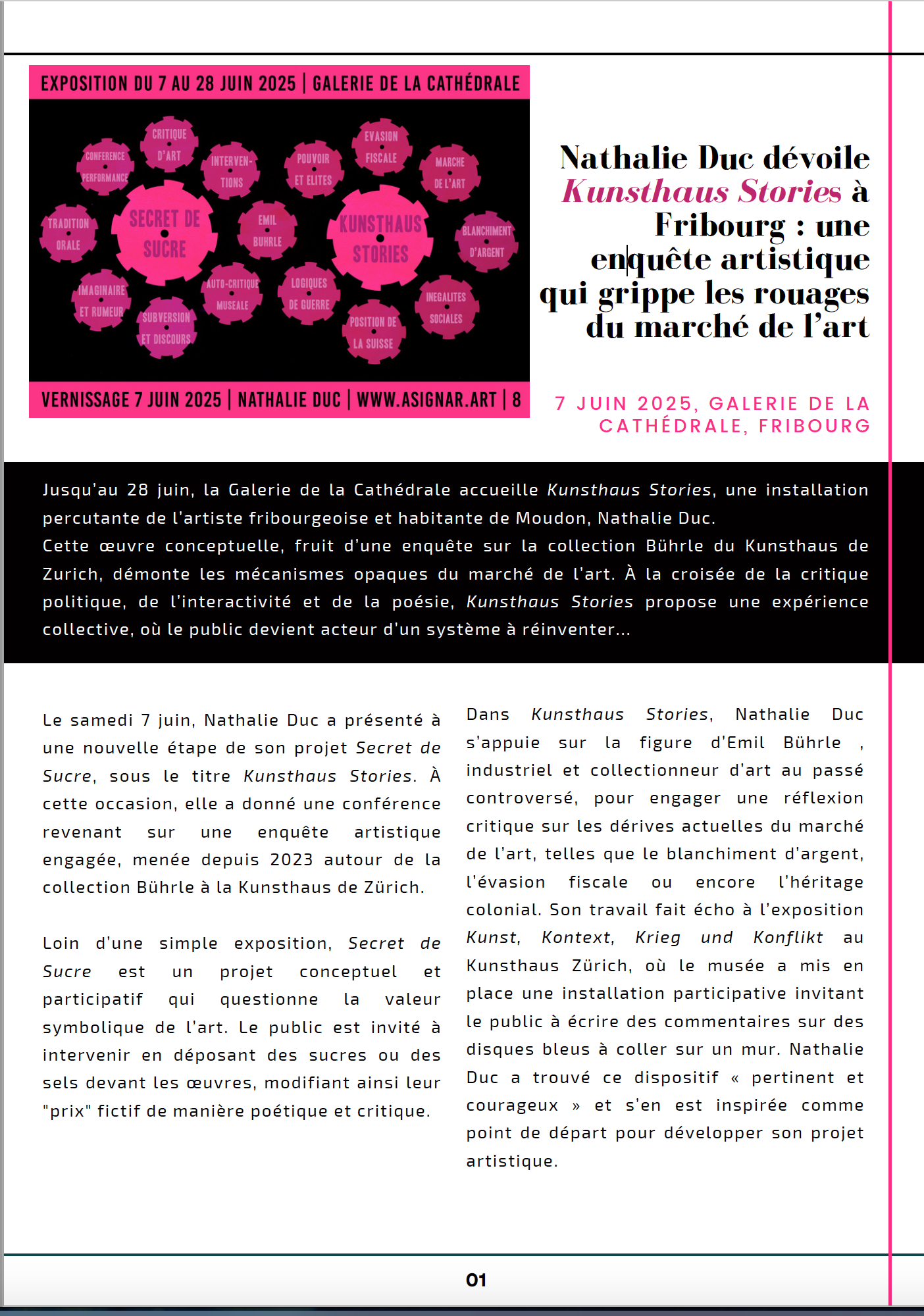 Jusqu’au 28 juin, la Galerie de la Cathédrale accueille Kunsthaus Stories, une installation percutante de l’artiste fribourgeoise et habitante de Moudon, Nathalie Duc. Cette oeuvre conceptuelle, fruit d’une enquête sur la collection Bührle du Kunsthaus de Zurich, démonte les mécanismes opaques du marché de l’art. À la croisée de la critique politique, de l’interactivité et de la poésie, Kunsthaus Stories propose une expérience collective, où le public devient acteur d’un système à réinventer…