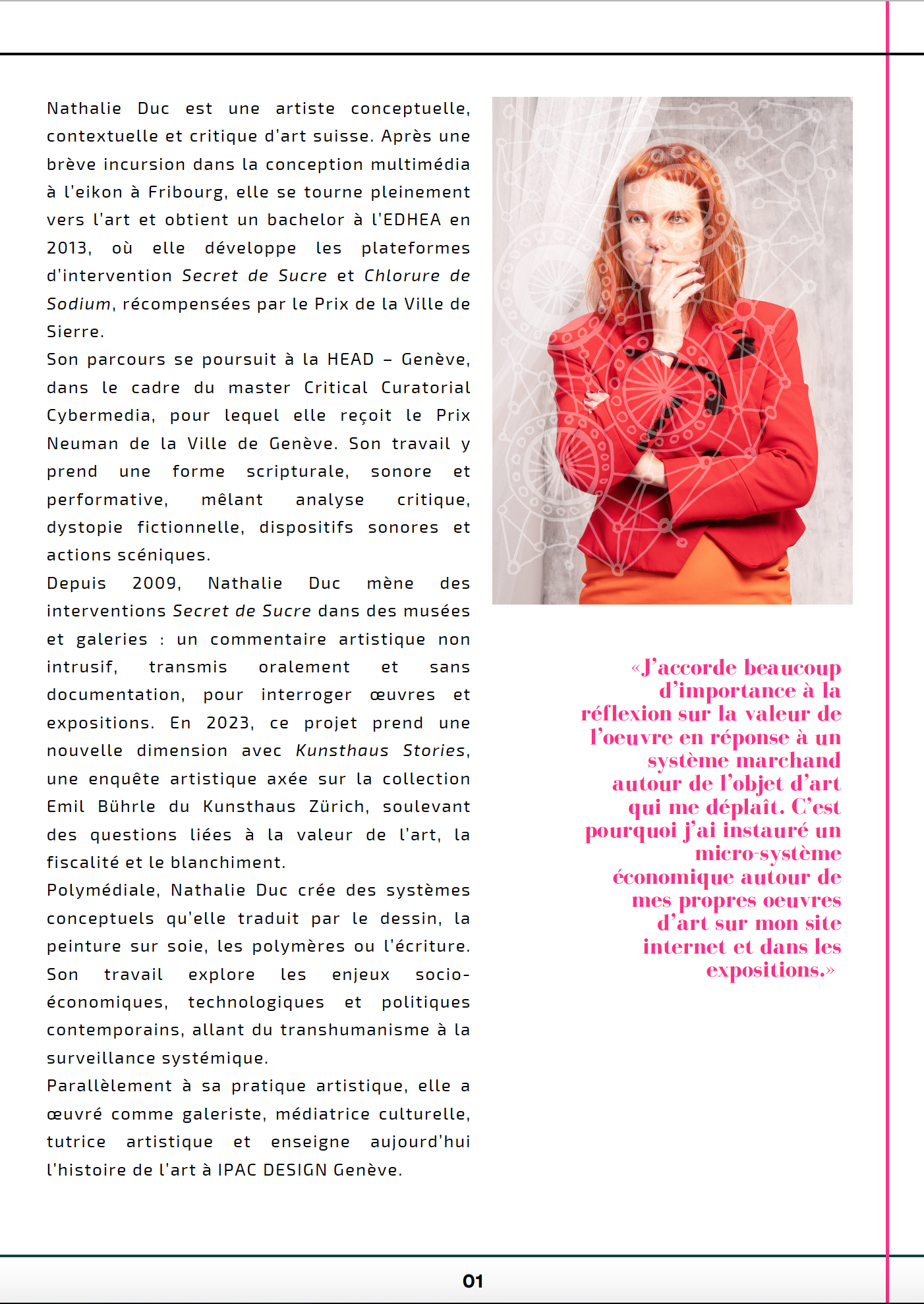 Nathalie Duc est une artiste conceptuelle,contextuelle et critique d’art suisse. Après une brève incursion dans la conception multimédia à l’eikon à Fribourg, elle se tourne pleinement vers l’art et obtient un bachelor à l’EDHEA en 2013, où elle développe les plateformes d’intervention Secret de Sucre et Chlorure deSodium, récompensées par le Prix de la Ville de Sierre. Son parcours se poursuit à la HEAD – Genève, dans le cadre du master Critical Curatorial Cybermedia, pour lequel elle reçoit le Prix Neuman de la Ville de Genève. Son travail y prend une forme scripturale, sonore et performative, mêlant analyse critique, dystopie fictionnelle, dispositifs sonores et actions scéniques. Depuis 2009, Nathalie Duc mène des interventions Secret de Sucre dans des musées et galeries : un commentaire artistique non-intrusif, transmis oralement et sans documentation, pour interroger oeuvres et expositions. En 2023, ce projet prend une nouvelle dimension avec Kunsthaus Stories, une enquête artistique axée sur la collection Emil Bührle du Kunsthaus Zürich, soulevant des questions liées à la valeur de l’art, la fiscalité et le blanchiment. Polymédiale, Nathalie Duc crée des systèmes conceptuels qu’elle traduit par le dessin, la peinture sur soie, les polymères ou l’écriture. Son travail explore les enjeux socio-économiques, technologiques et politiques contemporains, allant du transhumanisme à la surveillance systémique. Parallèlement à sa pratique artistique, elle a oeuvré comme galeriste, médiatrice culturelle, tutrice artistique et enseigne aujourd’hui l’histoire de l’art à IPAC DESIGN Genève.