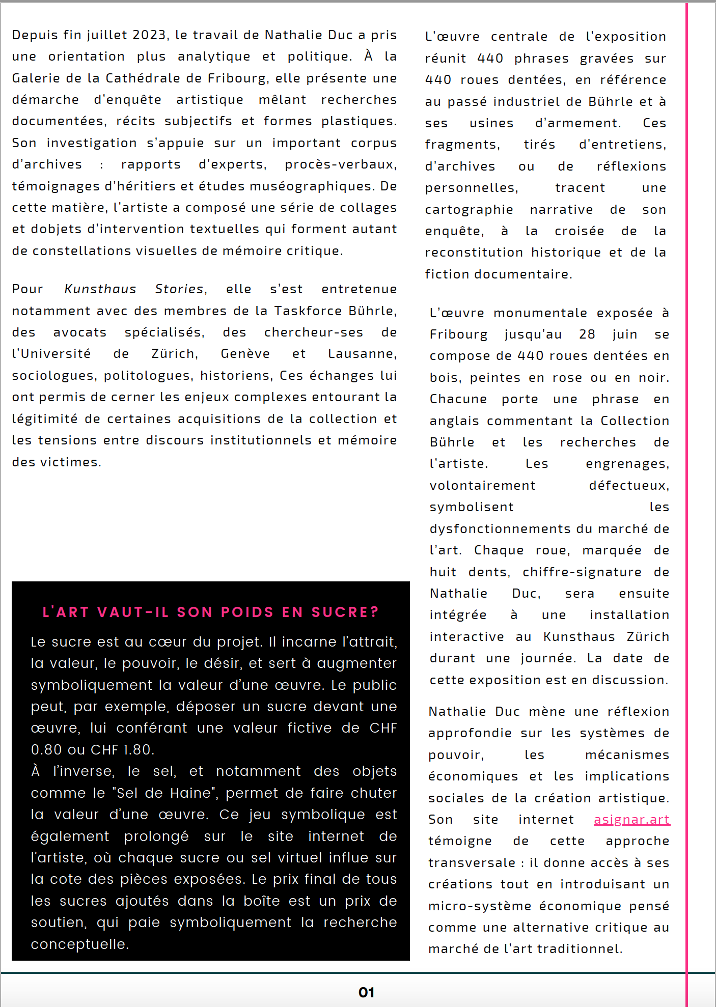 L’oeuvre monumentale exposée à Fribourg jusqu’au 28 juin se compose de 440 roues dentées en bois, peintes en rose ou en noir. Chacune porte une phrase en anglais commentant la Collection Bührle et les recherches de l’artiste. Les engrenages,volontairement défectueux, symbolisent les dysfonctionnements du marché de l’art. Chaque roue, marquée de huit dents, chiffre-signature deNathalie Duc, sera ensuite intégrée à une installation interactive au Kunsthaus Zürich durant une journée. La date de cette exposition est en discussion.