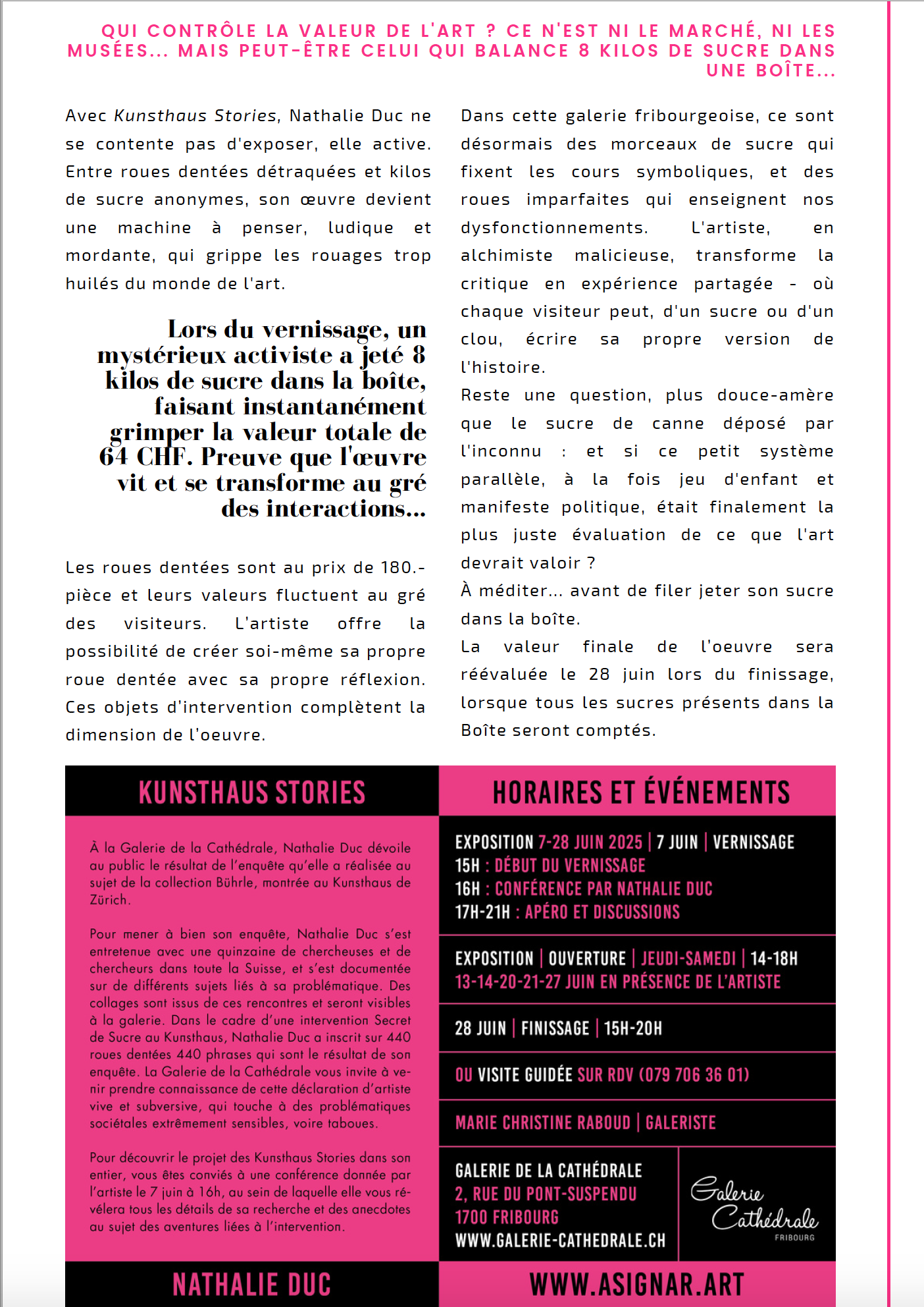 Avec Kunsthaus Stories, Nathalie Duc ne se contente pas d’exposer, elle active. Entre roues dentées détraquées et kilos de sucre anonymes, son oeuvre devient une machine à penser, ludique et mordante, qui grippe les rouages trop huilés du monde de l’art.